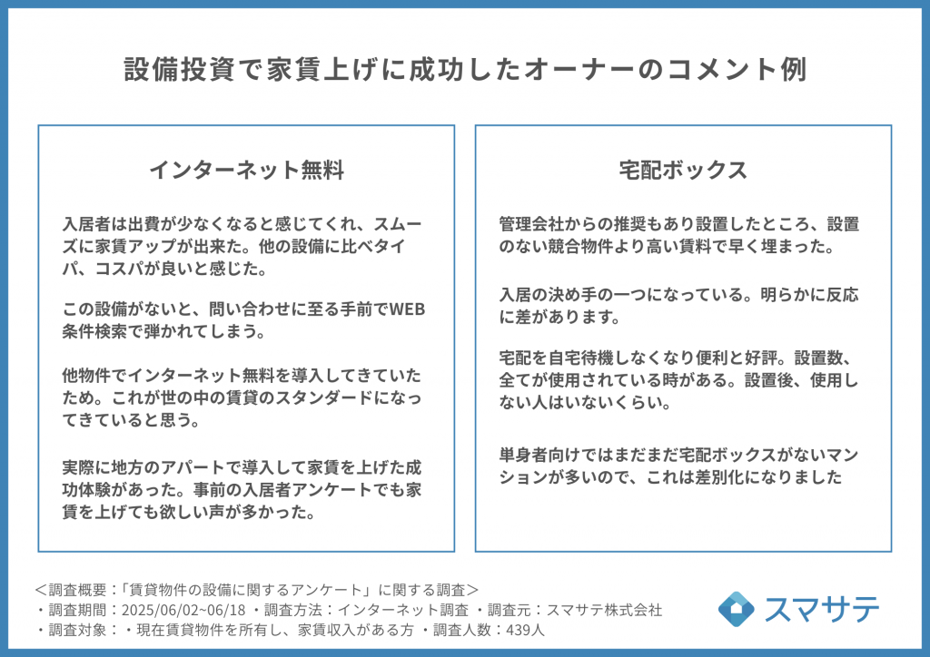 2025年6月2日~6月18日に対象となる賃貸不動産オーナー439名へ賃貸物件の設備に関するアンケートを実施、その結果をもとにオーナーが家賃アップに成功した設備やその平均金額、オーナーの設備投資の意思決定に関わる要素などをまとめた資料の無料配布を開始しました。